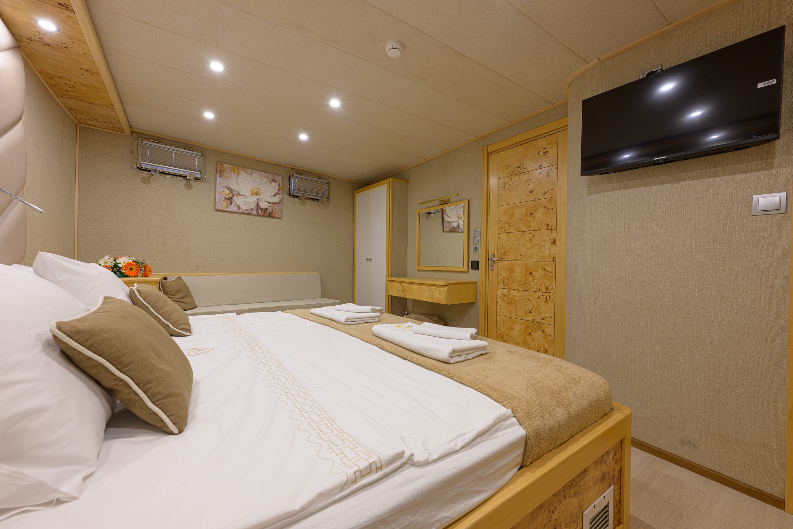 Belgin Sultan welcomes up to ten guests in five comfortable cabins, including one master and four double cabins. Each cabin has its own private bathroom and is fully air-conditioned, offering a quiet space to rest after a day at sea. Soft lighting, warm details, and high-quality bedding create a cozy atmosphere that feels calm and inviting.